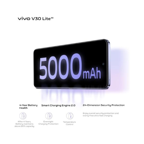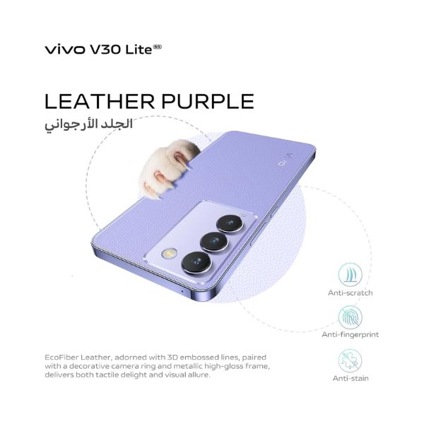 VIVO V30 Lite 5G Trendy Colors design with Leather skin featuring anti-stain & anti-scratch coating.